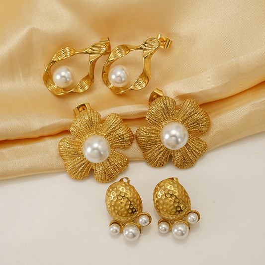 Vintage Style Titanium Steel Earrings 18k Gold-plated Petal Shaped Earrings Inlaid with Pearl Earrings for Women