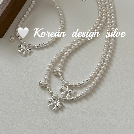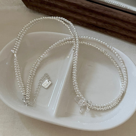 S925 Sterling Silver Bow Double Layered White Pearl Necklace Layered with High-end Collarbone ChainRegular price $116.00 USDRegular priceUnit price / per$0.00 USDSale price $116.00 USD