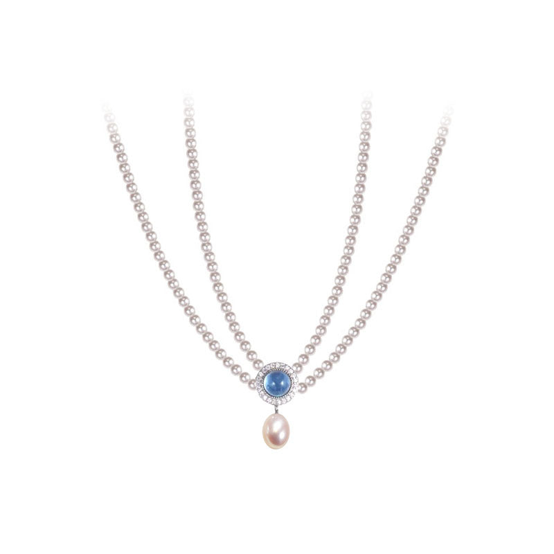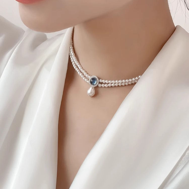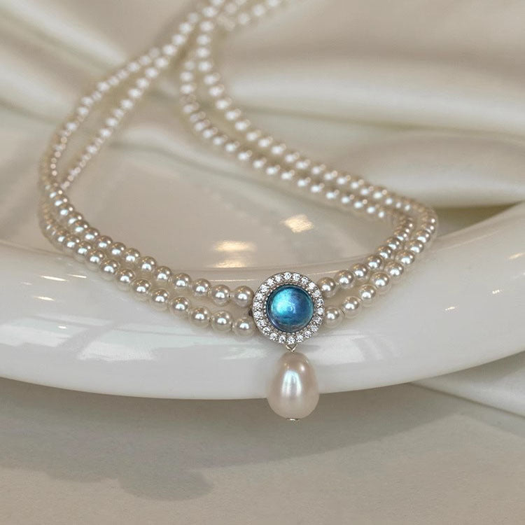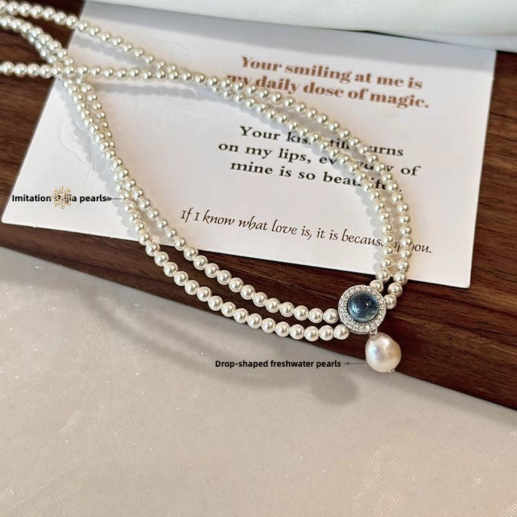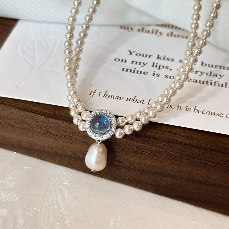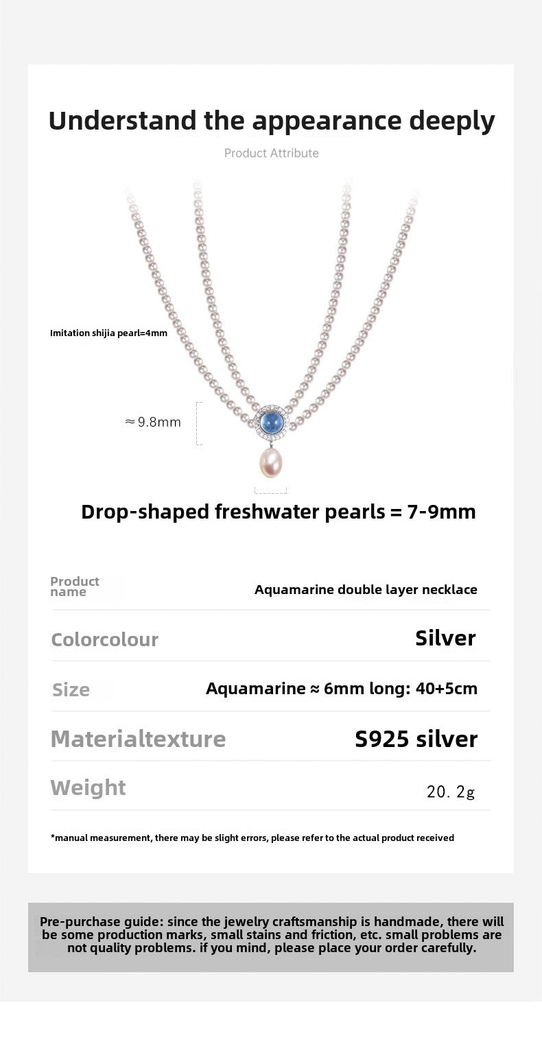 S925 Sterling Silver Natural Aquamarine High-quality Artificial Pearl Double-layer Necklace for Women's Collarbone Chain